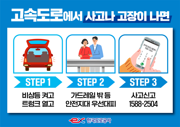 비상등을 켜고 삼각대(안전 삼각대)를 차량 후방에 설치하여 2차 사고를 예방합니다. 가능하다면 갓길이나 안전지대로 이동 후, 차량 밖으로 신속히 빠져나와 안전한 위치로 대피하세요. - 도로교통공사 무료 견인 요청